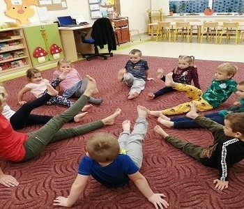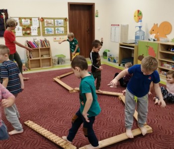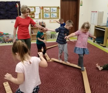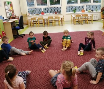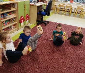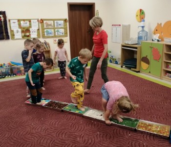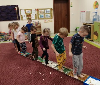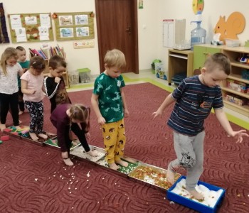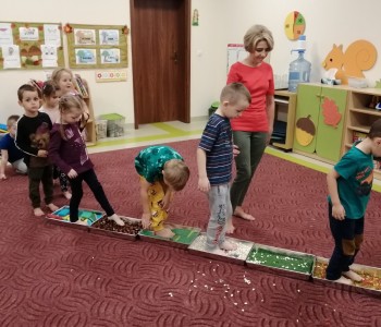 W grupie Wróbelka Elemelka ćwiczyliśmy swoje stopy spacerując na boso na piętach, na palcach, na zewnętrznej oraz wewnętrznej stronie. Nasze stopy bawiły się gazetami: unosiły je do góry, palce zgniatały gazety próbując zrobić z nich kulki, które posłużyły nam do masażu. Był też spacer po sensorycznym torze do ćwiczeń równowagi z wypustkami oraz ścieżce sensorycznej, które stymulują receptory na stopach, dostarczają wielu bodźców dotykowych i ćwiczą u dzieci dużą motorykę. Przechodząc po „ścieżce ruchu” trzeba było bardzo uważać na kierunki stawiania stóp. A kiedy nasze nogi już się zmęczyły postanowiliśmy poćwiczyć przypinanie skarpetek klamerkami do linki, bo przecież sprawność naszych dłoni jest również bardzo ważna. Sensoryczny dzień dostarczył nam wiele wrażeń, wszelkie bariery zostały przełamane i wszyscy bawiliśmy się wyśmienicie!