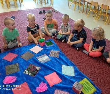 W ramach zajęć rozwijających zmysł dotyku, dzieci doświadczały stymulacji różnymi fakturami. Dzieci poznały określenia stosowane do doznań dotykowych (gładkie - szorstkie, miękkie - twarde).
